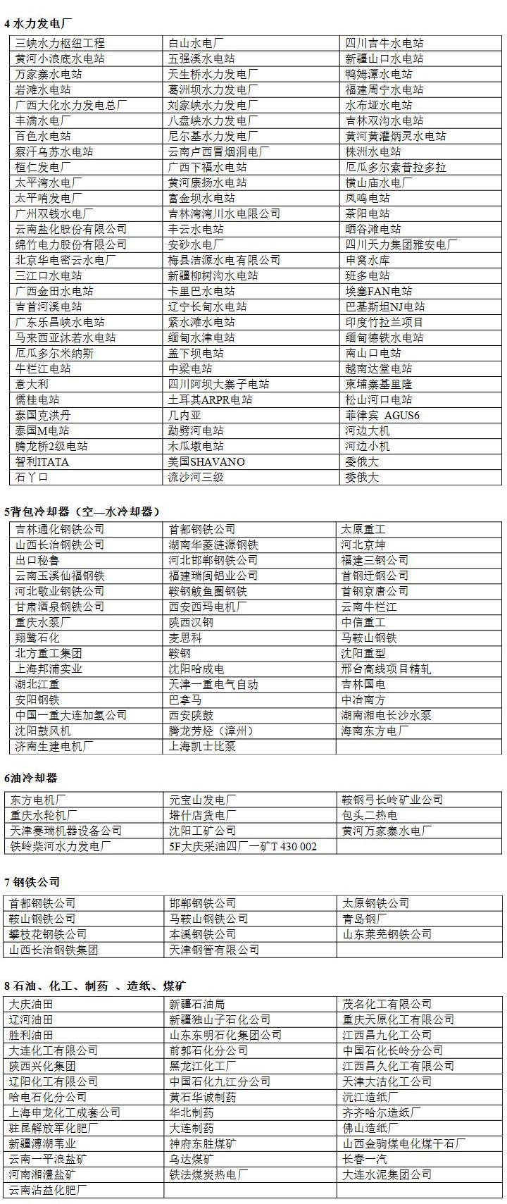1、哈爾濱電機廠 2、 杭州發(fā)電設(shè)備廠 3、東方電機廠 4、北京重型電機廠 5、天津發(fā)電設(shè)備廠 6、東風電機廠 7、沈陽電機廠 8、西安西瑪電機廠 9、南京汽輪電機廠 10、 昆明電機廠 11、濟南生建電機廠 12、重慶水輪機廠